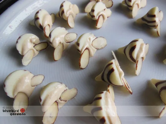 Spread melted white chocolate on Hershey Hug bottom; add two almond slivers for wings. Allow to dry.